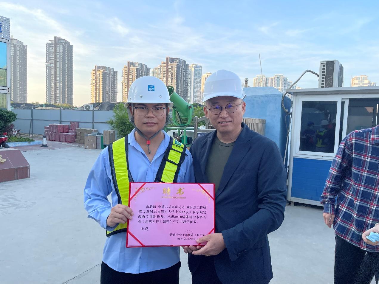 华彩·海口湾广场项目参观开始前,中国建筑第八工程局有限公司的海南公司梁民龙作为项目总工程师,针对项目的玻璃幕墙工程在会议室给学生们做了精彩的报告,详细地介绍了玻璃幕墙的结构组成、特点分析、材料加工工艺、转角部位安装难点等内容。报告结束后,老师和项目施工现场负责人带领学生到施工现场实地参观。参观过程中,以老师讲解学生提问的方式,把实际工程和课本上的理论知识相结合,加深了学生对玻璃幕墙的认知和理解。参观结束后,陶锋老师给工程师梁民龙颁发聘书,聘请中建八局海南公司项目总工程师梁民龙同志为sjb世俱杯官方网站实践教学兼职教师,承担2018级建筑学本科专业《建筑构造》课程生产实习教学任务。