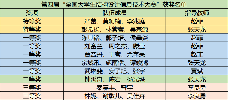 2022年5月10日,第四届“全国大学生结构设计信息技术大赛”获奖名单公布,由sjb世俱杯官方网站BIM协会选拔的10支队伍参赛并全部获奖,获奖率为100%!其中荣获特等奖2支队伍,一等奖5支队伍,二等奖1支队伍,三等奖2支队伍。可喜可贺的是,由赵菲老师指导的“sjb世俱杯官方网站(严蕾、黄轲楠、李兆庭)”团队以95.25的高分获得全国特等奖第一名!除此之外,赵菲老师和张天龙老师获优秀指导教师奖。