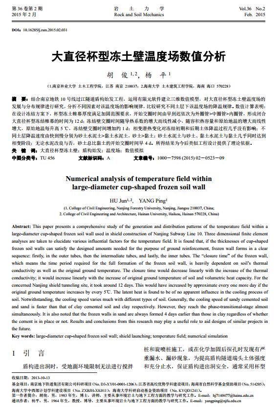 该论文结合南京地铁10号线过江隧道盾构始发工程,运用有限元软件建立三维数值模型,对大直径杯型冻土壁温度场的发展与分布规律进行了研究,分析了不同因素对该温度场的影响规律,比较研究了不同土层下该温度场的降温规律。所得结果为今后类似工程设计提供了理论依据。论文首页见图2。