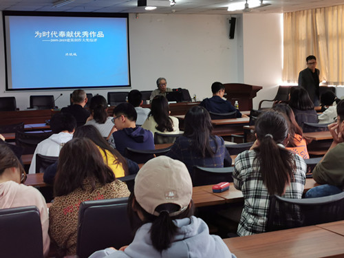 报告会现场,建筑系师生齐聚一堂,凝心聚神地聆听了国内知名建筑师、规划师洪铁城先生的一场精彩讲座:近10年国内建筑创作大奖综评。回首过去近三十年国内建筑创作状况,尤其是近10年的激情,洪先生的讲座娓娓道来,语言朴实中充满诗意,他提倡建筑语言的逻辑理性,提倡建筑对城市人文环境和对自然环境的尊重。在若干所举案例中,洪先生一一点评,将原创设计者的创作理念和思想传递给了年轻的莘莘学子。