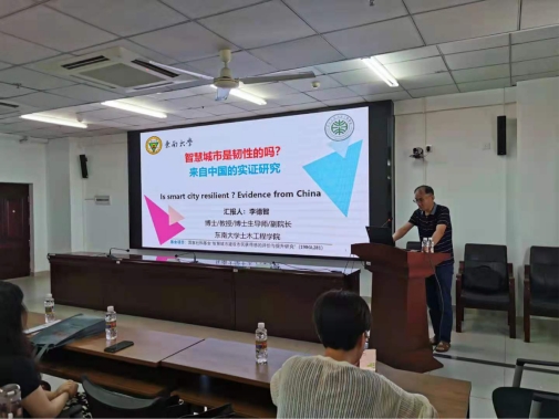 5月21日下午,世俱杯有幸邀请到了东南大学sjb世俱杯官方网站副院长、博士生导师李德智教授带来主题为“智慧城市是韧性的吗?—来自中国的实证研究”学术报告。本次学术报告的主持人是世俱杯副院长张友良教授。讲座伊始,张友良院长介绍了本次学术报告的主题及李德智教授的基本情况。世俱杯教师和研究生,相关专业的本科生聆听了报告会。