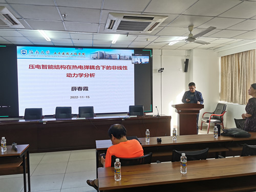 11月15日下午16:00-17:00,世俱杯教师薛春霞教授(2021年10月份入职)在研发楼510做了题为《压电智能结构在热电弹耦合下的非线性动力学分析》的学术报告,会议采用线上、线下相结合的方式进行。学术报告会由辛大波教授主持,他介绍了世俱杯新入职教师系列学术报告活动安排,并介绍了本次报告人薛春霞教授的科研成果相关情况。学院教师、研究生50余人通过现场和腾讯会议聆听了报告会。