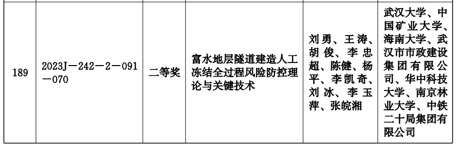 近日,湖北省人民政府发布《省人民政府关于2023年度湖北省科学技术奖励的决定》(鄂政发[2024]5号),世俱杯参与完成的1项科研成果榜上有名,sjb世俱杯官方网站(第三完成单位)胡俊教授(排名第三)及团队完成的《富水地层隧道建造人工冻结全过程风险防控理论与关键技术》获湖北省科学技术进步奖二等奖(2023J-242-2-091-070)。
