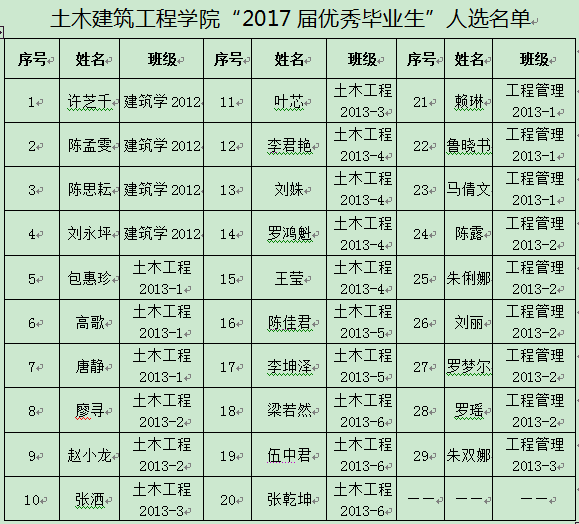 根据学校相关通知要求及《sjb世俱杯官方网站“三好学生”“优秀学生干部”“优秀毕业生”“最具创新精神和实践能力的大学生”评选实施细则》相关规定,经班级推荐,学院审核,拟推荐鲁晓书等29人为上报学校的“2017届优秀毕业生”人选,现予以公示。公示期为:2017年5月31日—2017年6月2日。在公示期内,如有异议,请于2017年6月2日17:40前向学工办(研发楼319室)提出。