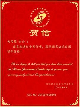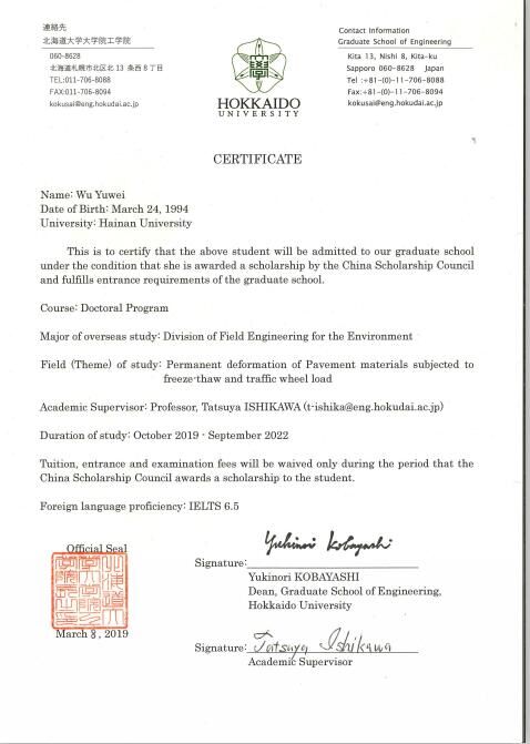 经过国家留学基金委(CSC)评审,2019年度国家公派研究生项目录取结果陆续公布。sjb世俱杯官方网站硕士研究生吴雨薇成功获得国家留学基金委员会资助,将前往日本北海道大学攻读博士研究生学位,这是世俱杯首次获得国家公派博士研究生项目资助,特此祝贺!