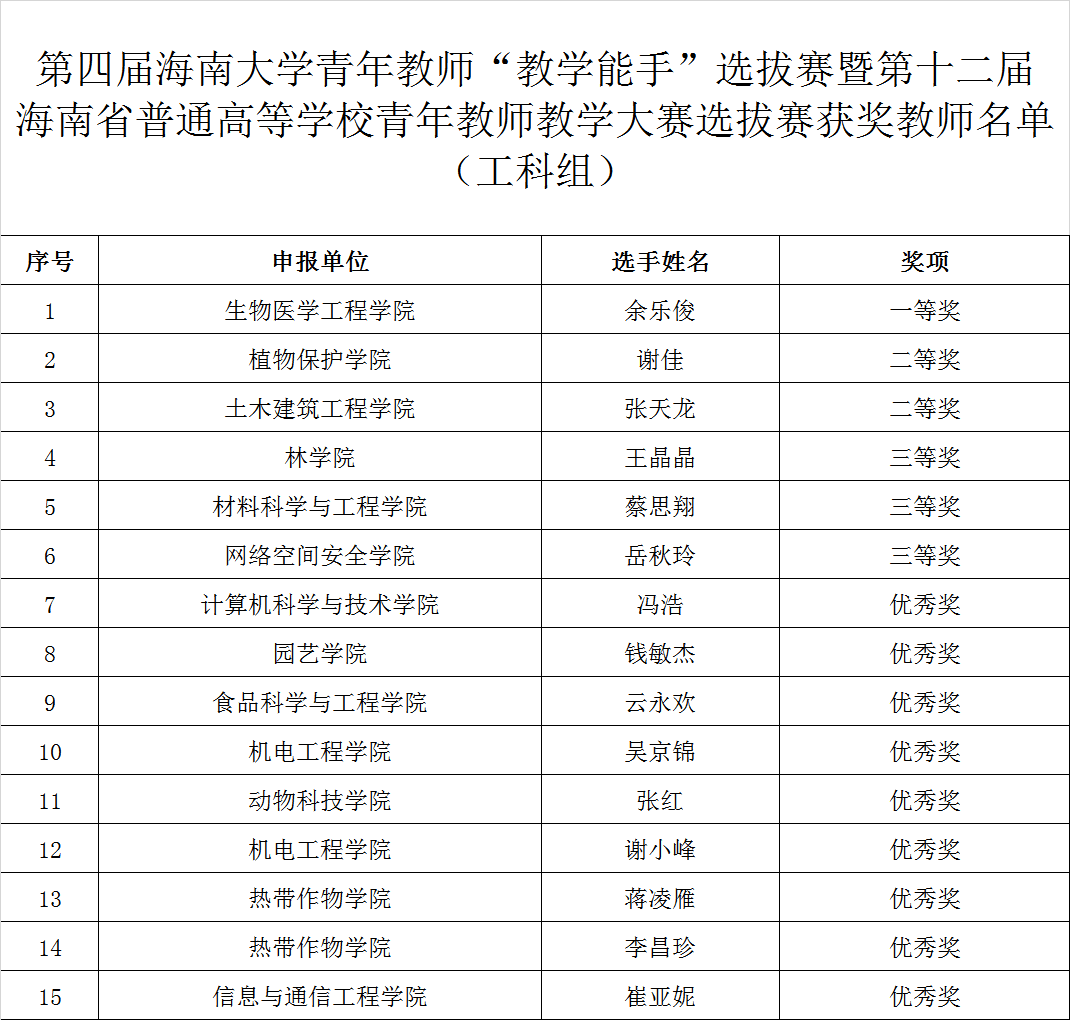 近日,sjb世俱杯官方网站公布了第四届sjb世俱杯官方网站青年教师“教学能手”选拔赛暨第十二届海南省普通高等学校青年教师大赛选拔赛的选拔结果,世俱杯张天龙老师荣获工科组二等奖,并将代表sjb世俱杯官方网站参加第十二届海南省普通高等学校青年教师教学大赛,sjb世俱杯官方网站在此次比赛中获得优秀组织奖。