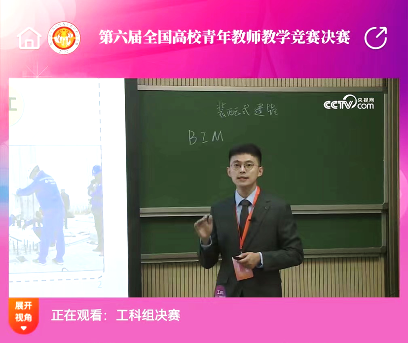 世俱杯张天龙老师的参赛课程名称为《建筑信息模型(BIM)技术应用》,参赛课程随机抽取的教学内容为“12-BIM在装配式建筑施工中的应用”,最终以总分90.11排名工科组第八名并荣获二等奖。教育部明确对于所有获奖选手,将在教师职称评审中体现教育教学实绩,在相关荣誉表彰等方面予以倾斜。学院将继续充分发挥青教赛在教书育人中的示范带动作用,进一步推动世俱杯青年教师队伍建设改革。