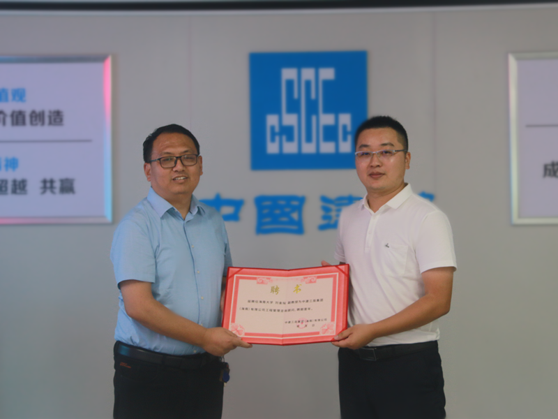 会议上,王伟代表中建三局集团(海南)有限公司,向sjb世俱杯官方网站工学博士、博士生导师胡俊教授颁发聘书,聘请其担任企业工程技术咨询顾问;向sjb世俱杯官方网站管理学博士、硕士生导师刘金灿副教授颁发聘书,聘请其担任企业工程管理咨询顾问。胡俊、刘金灿表示,将严格按照咨询顾问协议书的约定要求,主动加强与企业沟通交流,为企业摸清“痛点”、“难点”,提供专业性咨询意见,做好企业和学校的桥梁,积极推进产学研合作深度开展。