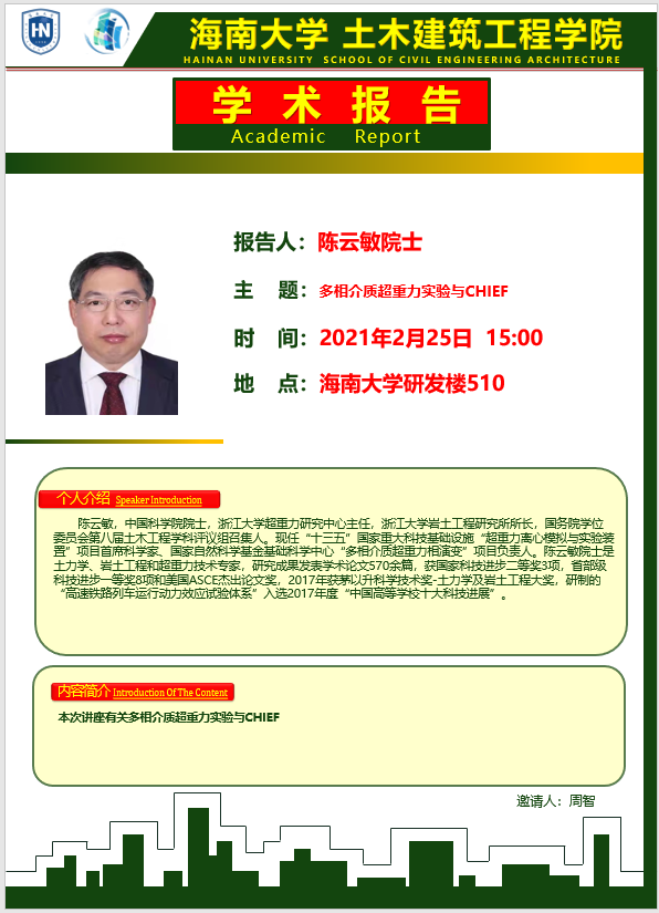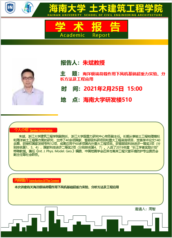 225日(周四)下午300点在sjb世俱杯官方网站研发楼510,浙江大学陈云敏院士和朱斌教授分别在世俱杯做《多相介质超重力实验与CHIEF》和《海洋极端荷载作用下风机基础超重力实验、分析方法及工程应用》学术报告。请各位老师和在校研究生务必参加,到时会做参会签名,考勤记录。