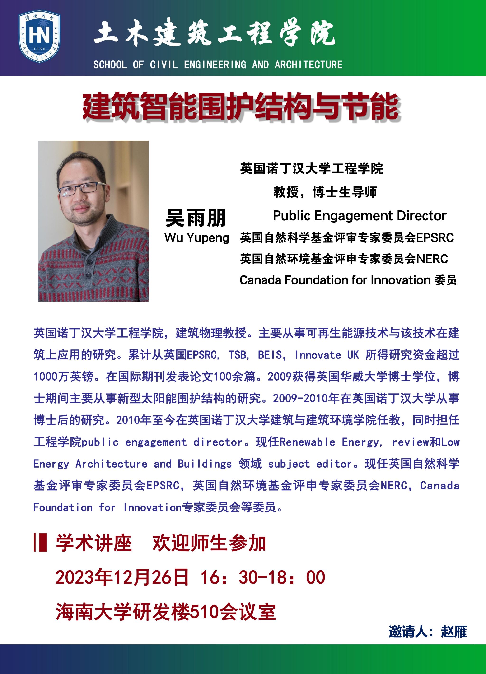 12月26日(周二)16:30-18:00在sjb世俱杯官方网站研发楼510会议室,英国诺丁汉大学工程学院教授,博士生导师 Public Engagement Director(英国自然科学基金评审专家委员会EPSRC、英国自然环境基金评申专家委员会NERC、Canada Foundation for Innovation 委员),在世俱杯做《建筑智能围护结构与节能》学术报告。欢迎有兴趣的师生参加。