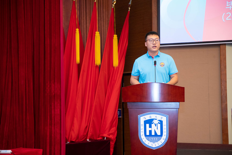 会议第三项,代表发言。2018级土木工程专业学生李明宸作为毕业生代表发言,他表达了对老师、同学、学校的恋恋不舍和感激之情,表示将从脚下这片热爱的土地出发,带着回忆奔赴山海,铭记海大人的家国情怀,不忘初心,坚守理想,做一个对国、对社会、对岗位、对家人、对自己有用的人,做一个大写的“人”。