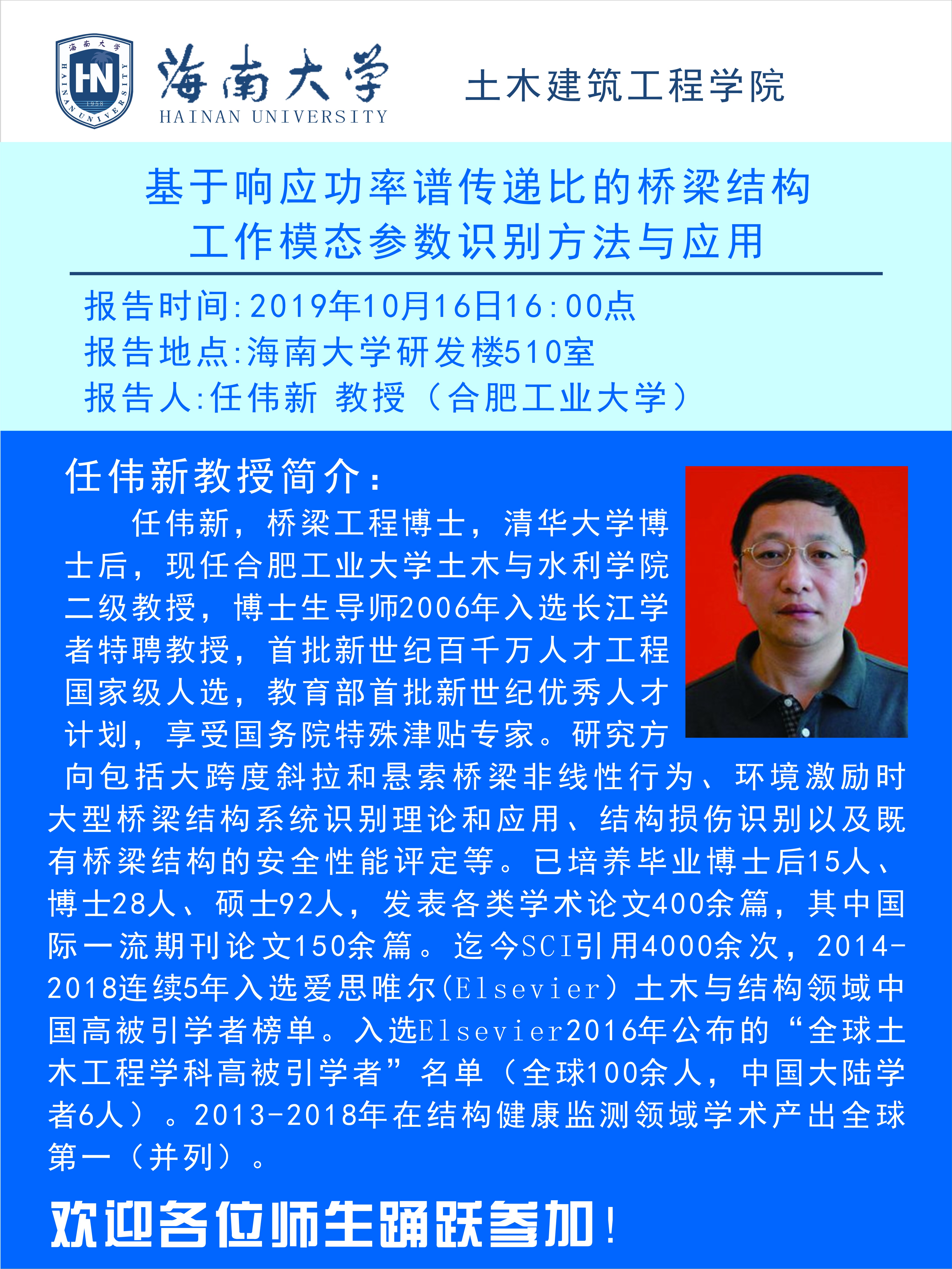 讲座人:任伟新(合肥工业大学土木与水利学院博士生导师,二级教授)