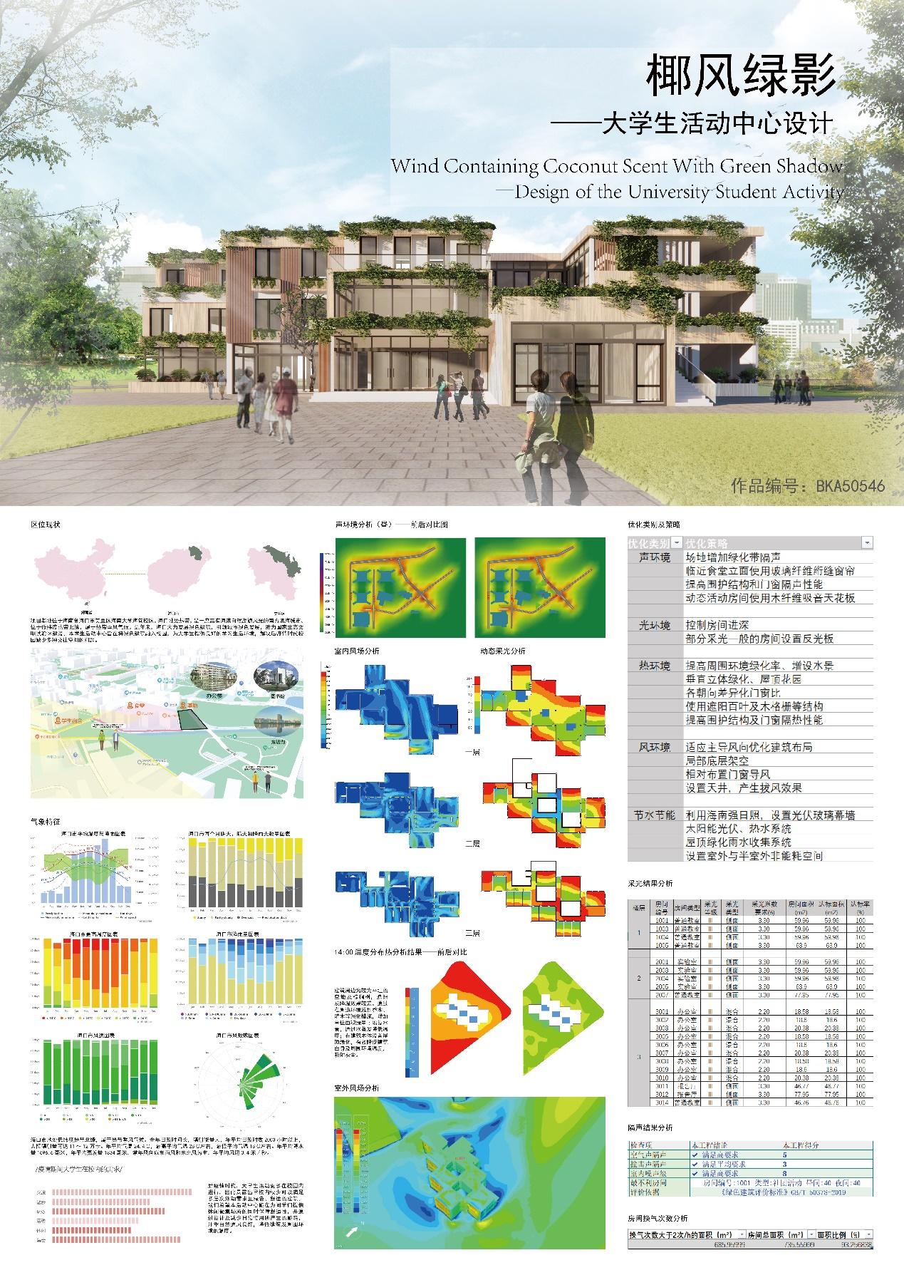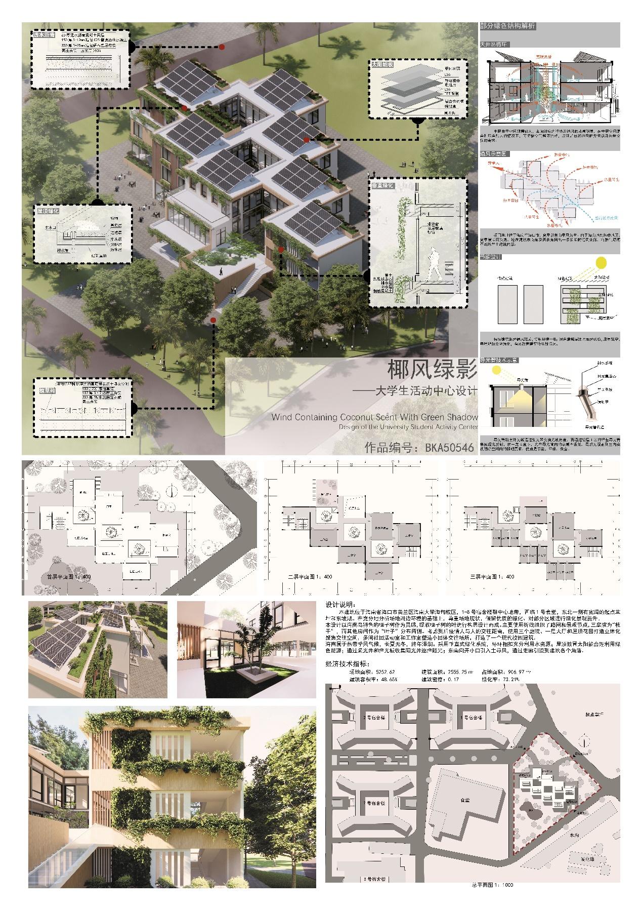 优秀作品奖是椰风绿影——大学生活动中心设计,本建筑位于海南省海口市美兰区sjb世俱杯官方网站海甸校区,1-8号宿舍楼群中心地带,西临1号食堂,东北一侧有宽阔的起点草坪和东坡湖。在充分地分析场地周边环境的基础上,尊重场地现状,保留优质的绿化、对部分区域进行绿化景观提升。