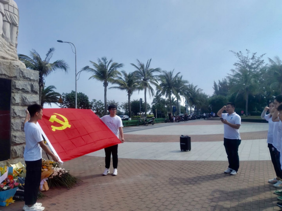学生党员代表在渡海英雄纪念碑前介绍解放军渡海作战情况,学生党员参加了集体悼念仪式,向烈士敬献鲜花,并面对鲜红的中国共产党党旗,高举右手,重温了入党誓词。