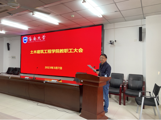 2023年3月7日下午,sjb世俱杯官方网站新学期教职工会议在研发楼510报告厅召开。学院全体党政领导班子成员张长海书记、周智院长、邱宙廷副院长、张友良副院长、田元福副院长、薛春霞副院长、辛大波副院长、系主任、实验教学中心负责人、科室管理职员和全体教师等参加会议。会议由学院院长周智主持。